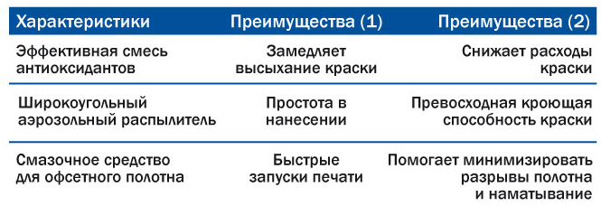 Предотвращает образование пленки на красочных валиках. INK-RЕАDI - смесь антиоксидантов, которые образуют защитную пленку, предотвращающую образование приставание краски к валикам, красочным валикам и в банках с краской. Это средство не имеет пагубного влияния на цвет, консистенцию или скорость высыхания офсетных красок. INK-RЕАDI также может быть использован в качестве смазочного средства для офсетного полотна, которое снижает липкость при старте печати, таким образом минимизируя риск на-мота материала на валики.